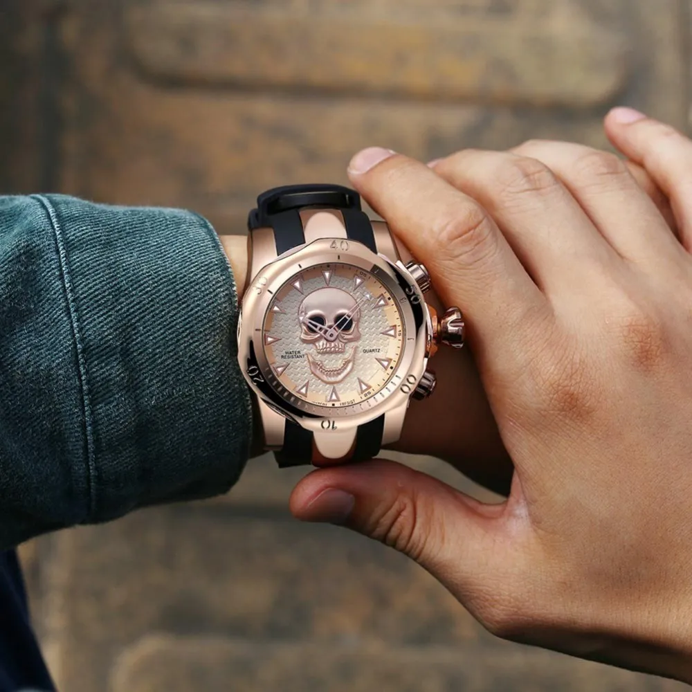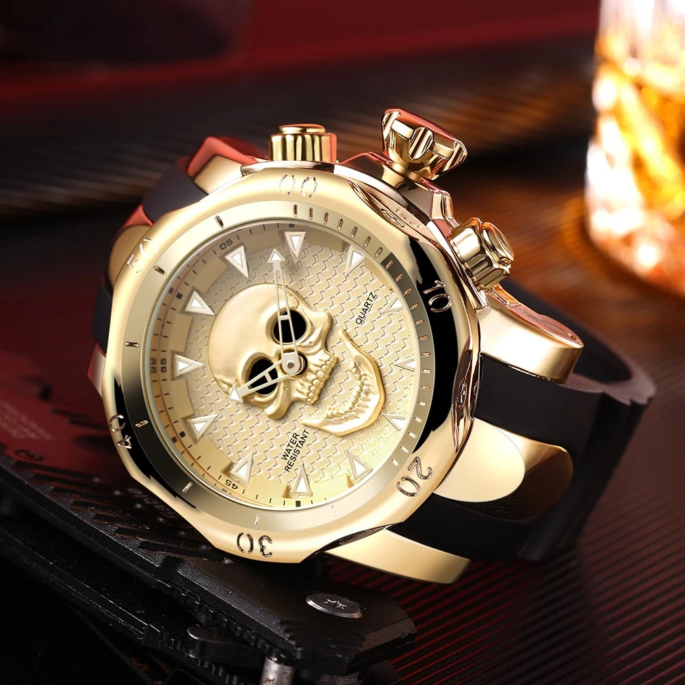 Jiangyuyan Cool Big Dial Skull Watch Men Gold Silicone Strap Wristwatch Mens Watches Top Brand Luxury Casual Quartz Clock Men