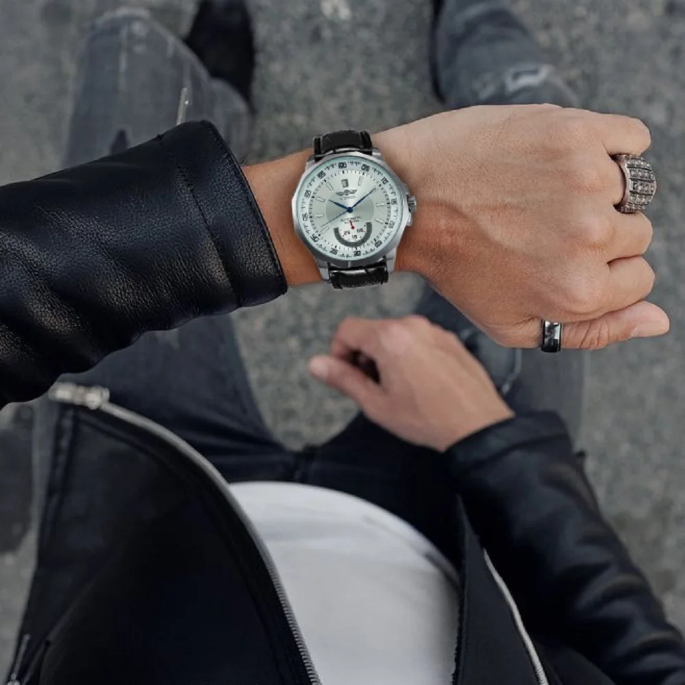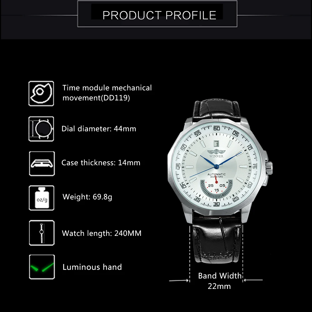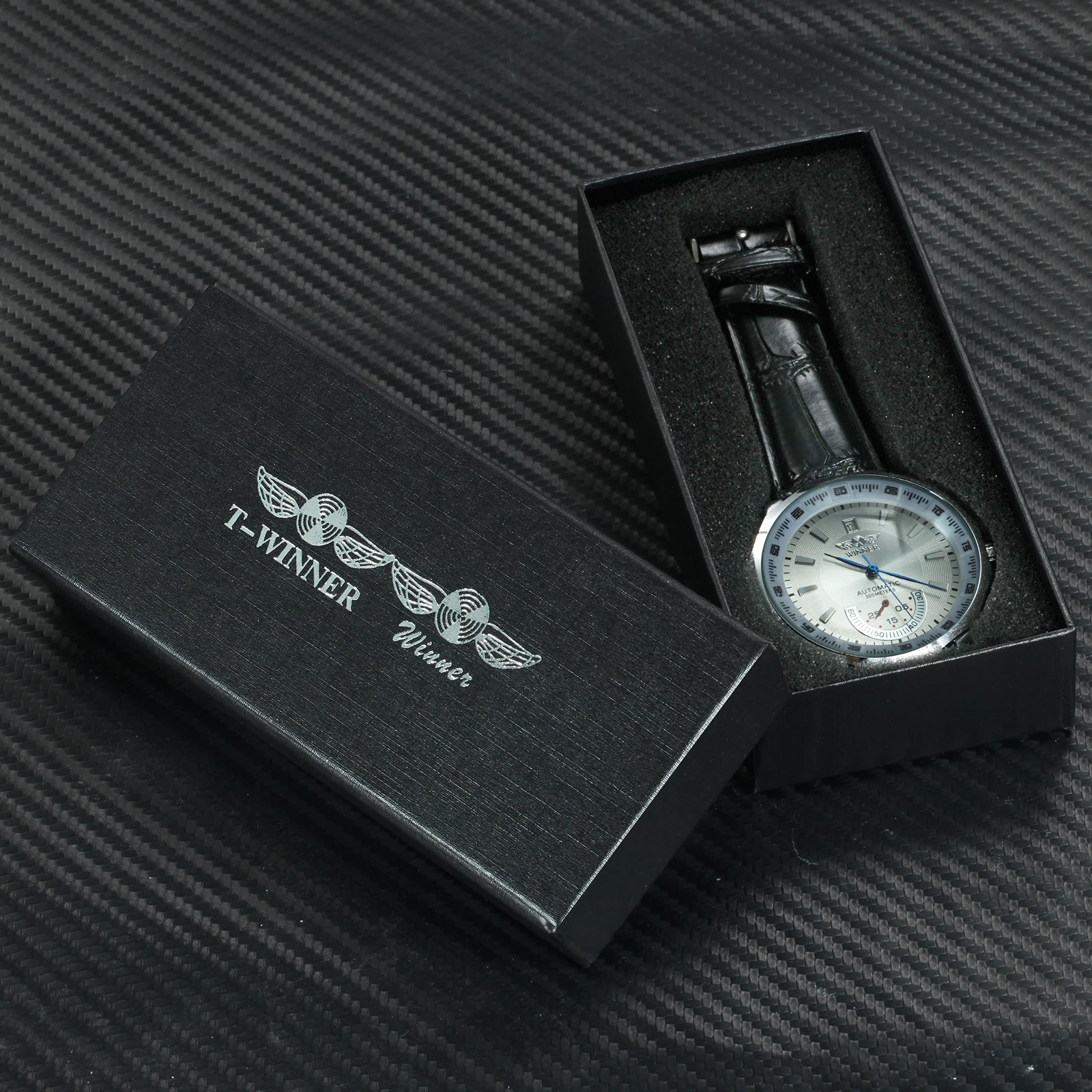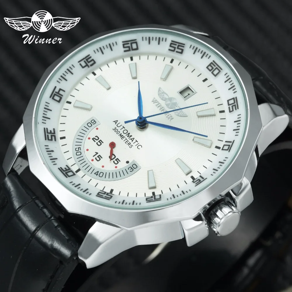 Winner Official Automatic Watch Men Brand Luxury Mechanical White Dial Leather Strap Dual Date Display Minimalist Wristwatches