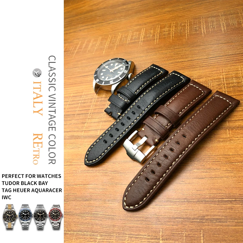19202122Mm Italy Genuine Leather Watch Strap High Quality Watch Band Universal Belt Tudor Black Longines Breitling